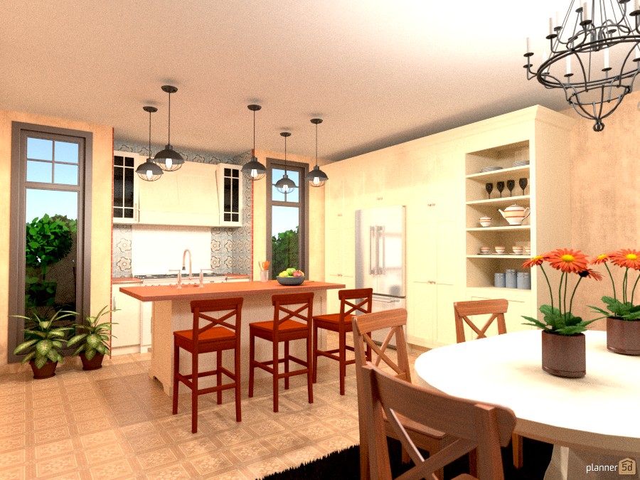 Подходит тем, кто любит готовить и собирать всю семью за столом для каждодневных трапез или у кого нет возможности отделить столовую. Кухню-столовую делают в интерьерах для маленьких семей, которым нужен небольшой обеденный уголок.