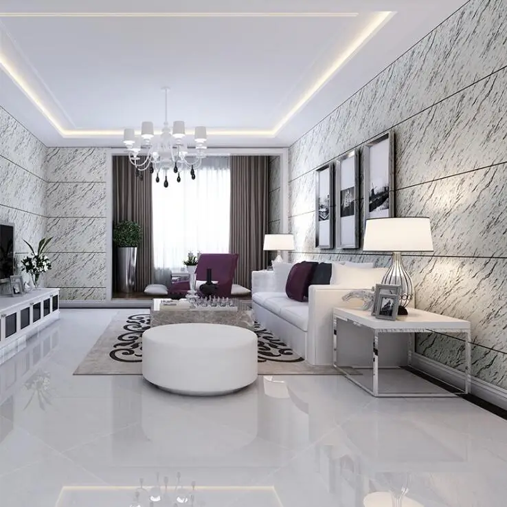 - Светлые стены считаются удачным продолжением белого пола. Если для оформления выбрана классическая стилистика, то подойдет штукатурка с белыми плинтусами или обои с ненавязчивым светлым рисунком. Для современных направлений уместно применять кирпичную кладку и обои с узорами. На одну из стен допустимо наклеить фотообои с объемным изображением;