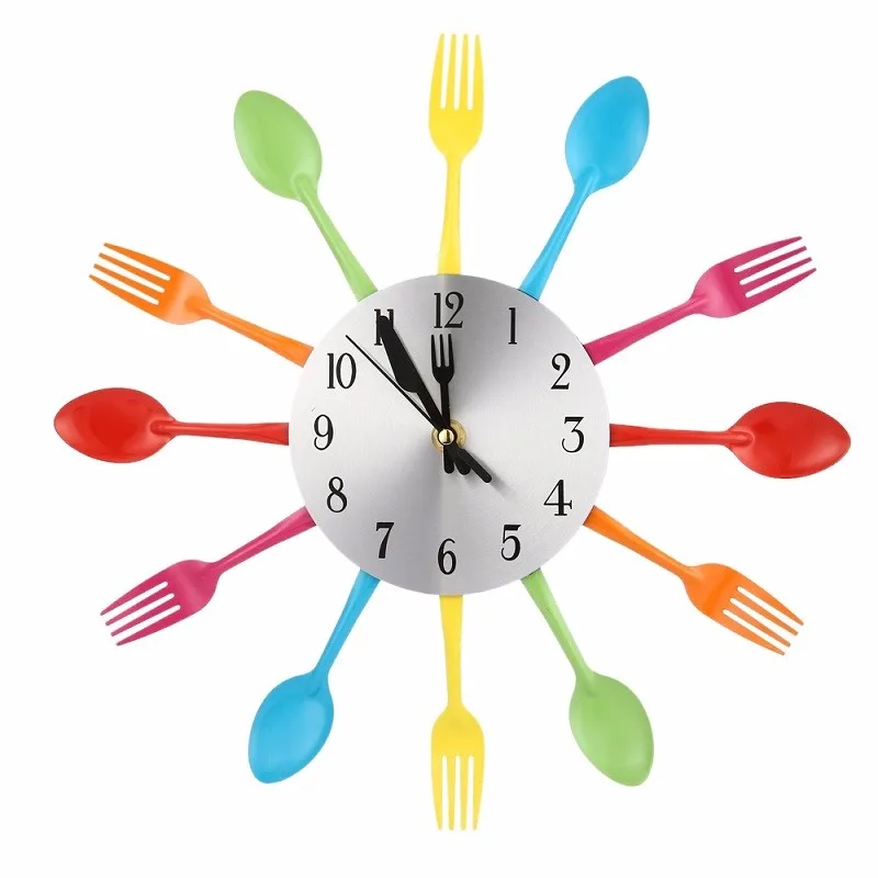 Часы могут быть достаточно нестандартными. Например, в качестве основы нередко используют разложенные кругом вилки, ножи или ложки. Такие часы смотрятся необычно и сразу привлекают внимание, тем более, что они идеально подходят для кухни.