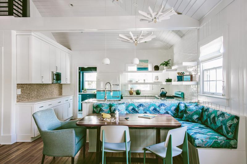Не обойтись без морского цвета и в интерьерах прибрежной тематики. Это один из ключевых тонов «пляжной» палитры.
