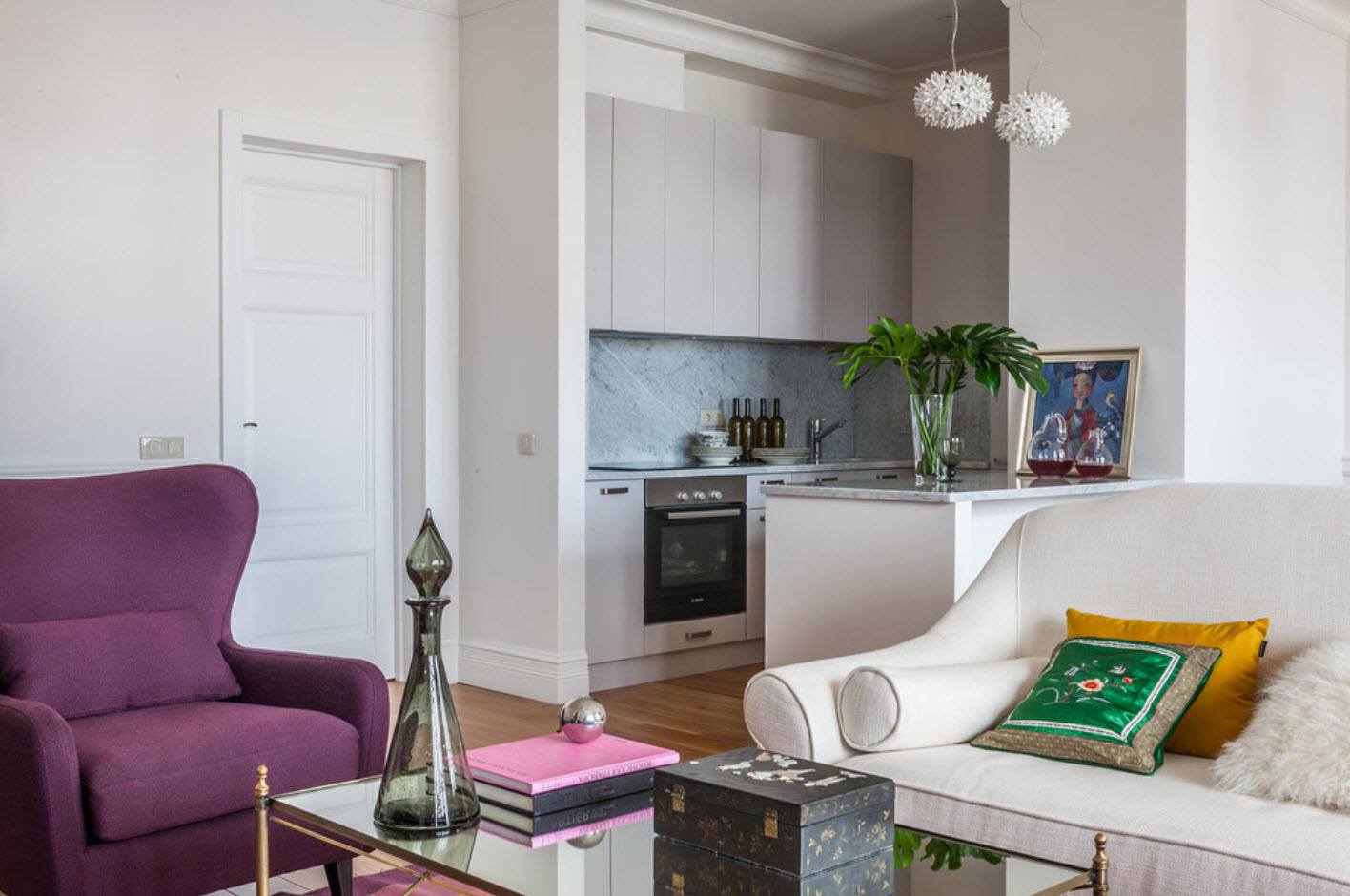 Существенным плюсом является то, что она способна увеличивать визуально пространство. Это отличное решение для небольших квартир. Это поможет сэкономить площадь, которая была бы использована для постройки стен и дверей. Она позволит вам готовить еду и при этом смотреть, что происходит в гостиной, общаться со своей семьей и смотреть телевизор, находящийся в гостиной комнате.