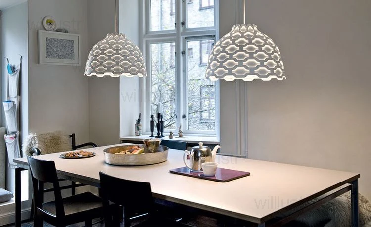 Обеденная зона, как правило, имеет почти во всех домах немудрёный, весьма стандартный облик: стол да стулья, ну, иногда ещё ваза с фруктами или цветами. Именно в такой ситуации акцент можно сделать на остроумной форме дизайнерского светильника, который сразу же займёт лидирующее место не только в вечернем, но и в дневном интерьере.