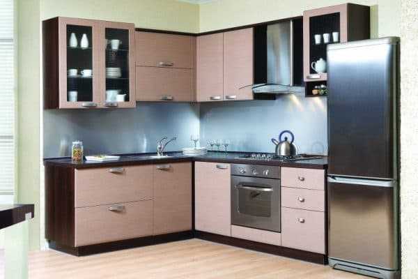 - Г-образная, или угловая — кухонный гарнитур устанавливается в виде буквы «Г».