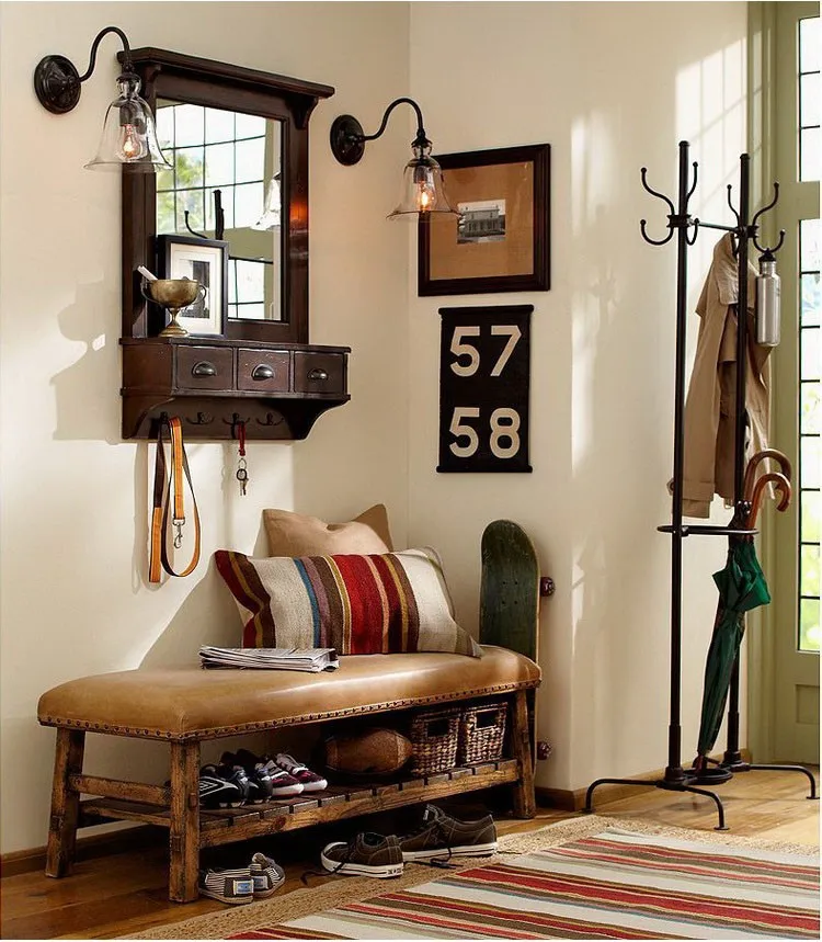 • пуф, кресло либо скамейку, где удобно надевать или снимать обувь. В идеале еще иметь столик или консоль для пакетов и сумок, ведь в дом редко приходят с пустыми руками. Но если места катострофически мало, вещи придется ставить на пуф или вешать их на крючок (предусмотрите его у входа).