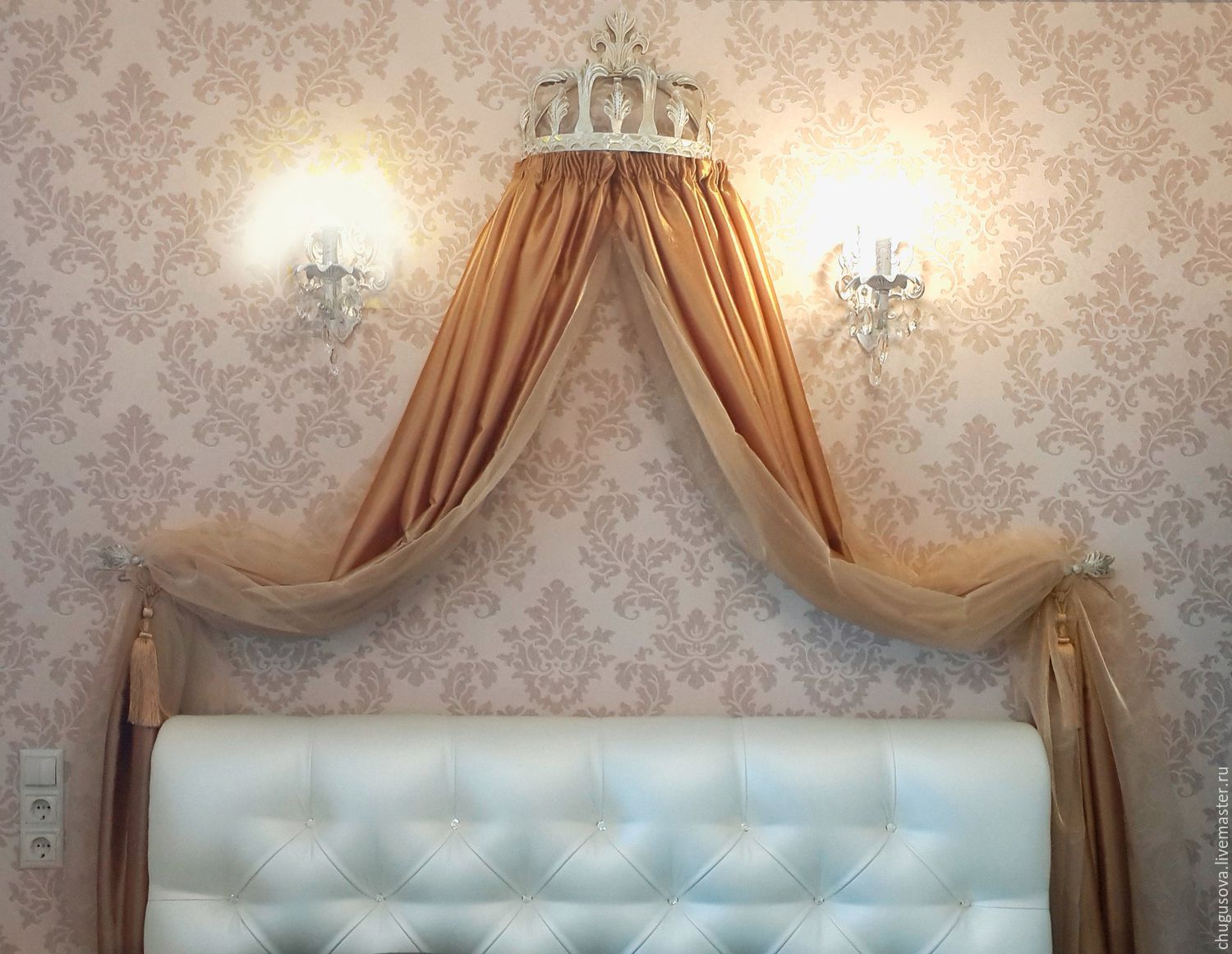 - Место крепления прячется еще одним отрезом драпировки или специальным ламбрекеном. Длину полога можно регулировать, применяя стильные зажимные элементы или красивые бантики.