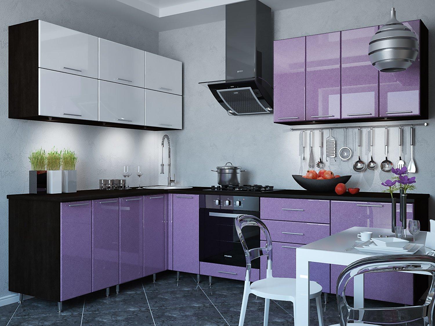 Его можно комбинировать с красным, синим и серым. Серо-фиолетовая модель кухни будет выглядеть футуристично и модно.