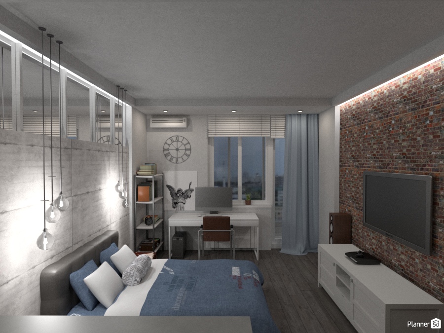 Классический вариант оформления такого стиля в небольшой квартире предполагает наличие открытого пространства без лишних перегородок. Отдельной комнатой будет только санузел. При этом кухню от гостиной зоны вы можете отделить, например, с помощью барной стойки или небольшого декоративного камина. Для данного стиля характерно оформление кирпичом. Ваше рабочее место вы можете отделить с помощью раздвижного комода.