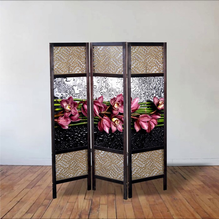 Одноэкранные перегородки. Конструкция состоит из одной сплошной створки. Один весомый недостаток такой ширмы — она не складывается. Внутренняя часть изготавливается из плотной ткани или пластика. Есть разные цветные варианты с орнаментом. Некоторые модели выпускаются с колесиками для удобного передвижения.