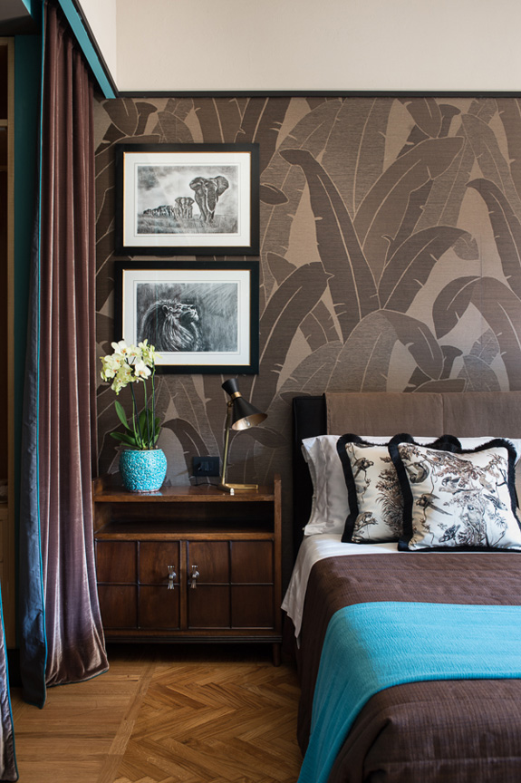Приглушённый коричневый как нельзя лучше подходит для интерьера спального пространства. Тёмно-коричневый, светло-коричневый и бирюзовый придают гармонию и уют в атмосферу спальни.