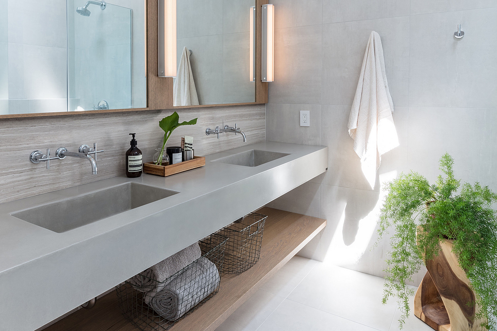 Бетонные столешницы — один из самых дорогих вариантов — будьте готовы заплатить от 58 до 140 долларов за квадратный фут, изготовленный и установленный. Они являются хорошим выбором, если вы хотите сделать особый акцент в дизайне, а также могут хорошо послужить для семейных ванных комнат с интенсивным использованием.